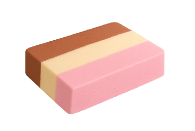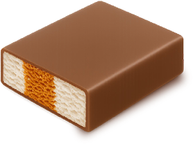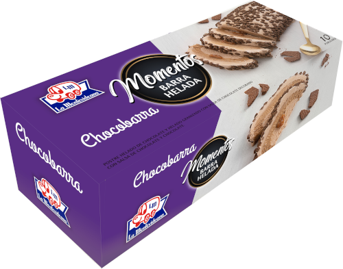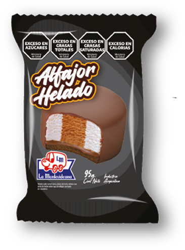 Helado de americana y dulce de leche relleno con dulce de leche sobre tapa de alfajor con baño de chocolate.