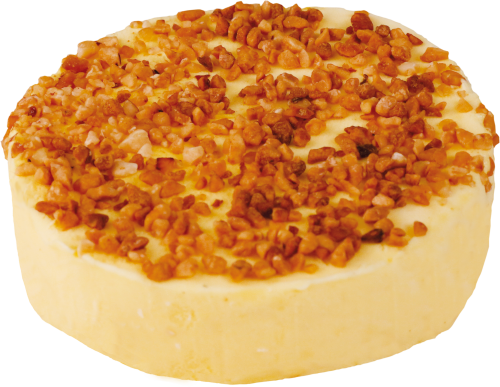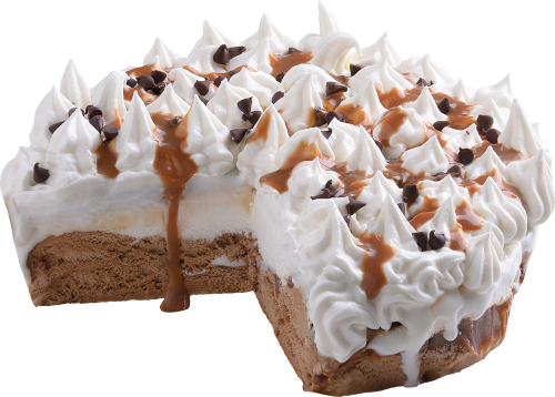 Torta helada de dulce de leche y americana con salsa de dulce de leche y gotas de chocolate.
