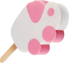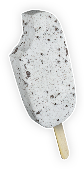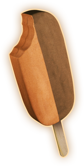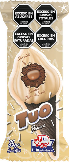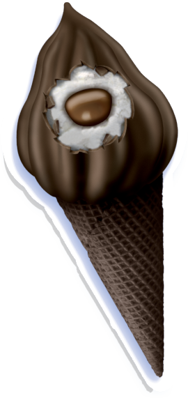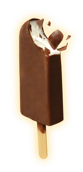 Helado de chocolate relleno con dulce de leche, con baño de chocolate blanco.