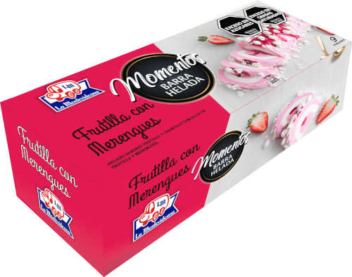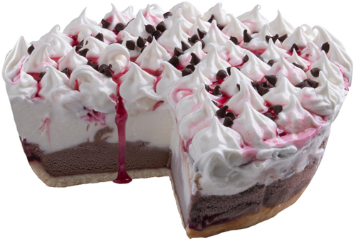 Postre helado de frutilla y chantilly con salsa de frutilla y merengues.